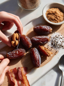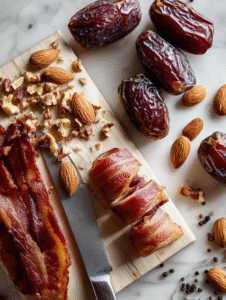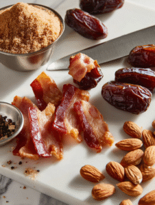 - Gather your ingredients: pitted Medjool dates, thin-cut bacon, toothpicks, and optional fillings like almonds or a sprinkle of brown sugar.