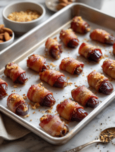 - Place the wrapped dates evenly on the prepared baking sheet, spacing them apart for proper crisping.