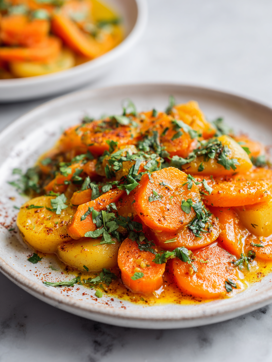 This hearty carrot and potato curry is made by simmering tender vegetables in a fragrant spice-infused coconut milk sauce, resulting in a comforting, velvety dish with vibrant colors and rich aroma. The dish showcases a rustic, imperfect charm, with soft vegetables soaking up bold flavors and creating a warm, inviting appearance.