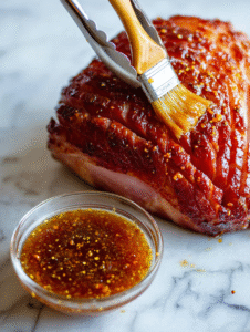 - Use the pastry brush to generously coat the ham with the warm glaze, ensuring every nook and cranny is covered. This helps the glaze adhere during baking.