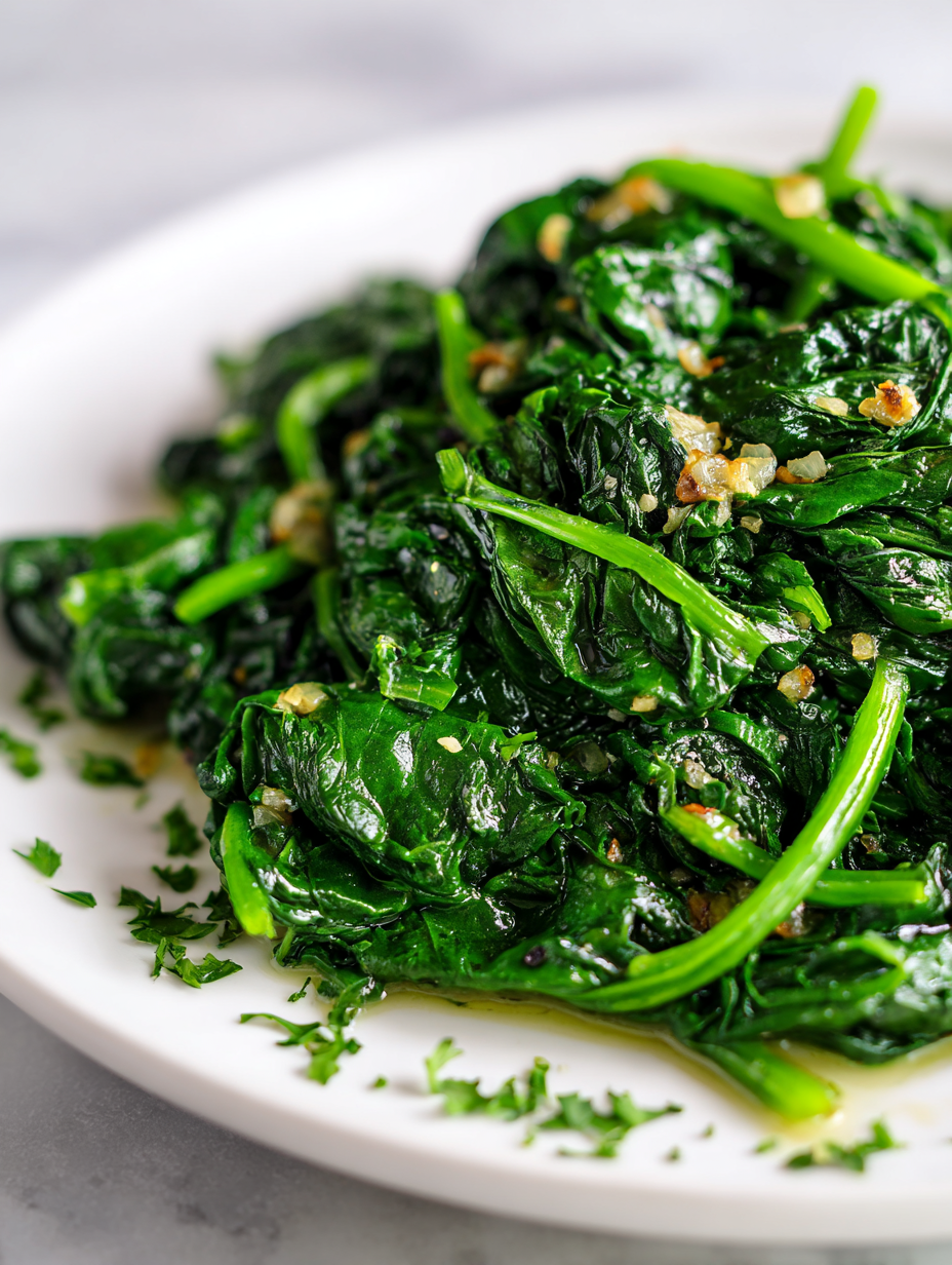 This dish features fresh spinach quickly sautéed with fragrant garlic in olive oil, resulting in tender, glossy leaves infused with a rich, nutty aroma. The final appearance is vibrant green and slightly wilted, with a savory scent that fills the kitchen. It’s a simple yet soulful side that highlights the magic of fresh ingredients and aromatic garlic.