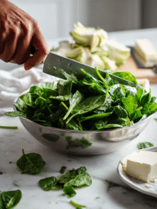 - Wash and roughly chop the fresh spinach. If using frozen, thaw thoroughly and squeeze out excess moisture.