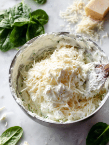 - In a mixing bowl, combine the softened cream cheese, grated Parmesan, and shredded mozzarella. Mix until smooth and creamy.