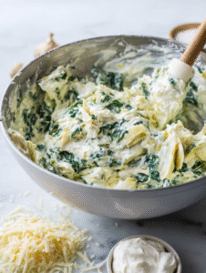 - Fold the sautéed spinach and chopped artichokes into the cheese mixture, creating a vibrant, textured base.