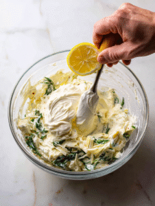 - Add the mayonnaise or sour cream along with a squeeze of fresh lemon juice. Stir to combine evenly, creating a smooth, cohesive mixture.